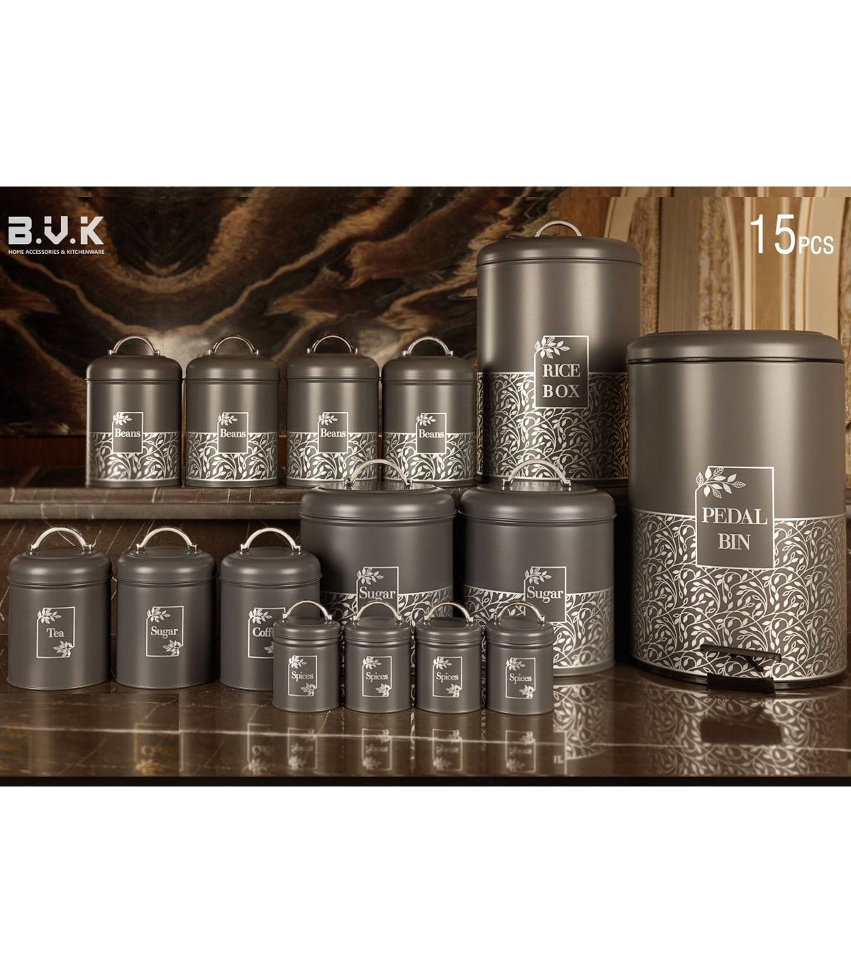 - شامل یک عدد سطل برنج، یک عدد سطل زباله، یک عدد سطل قند، یک عدد سطل شکر، یک عدد ظرف چایی، شش عدد ظرف حبوبات، چهار عدد ظرف ادویه