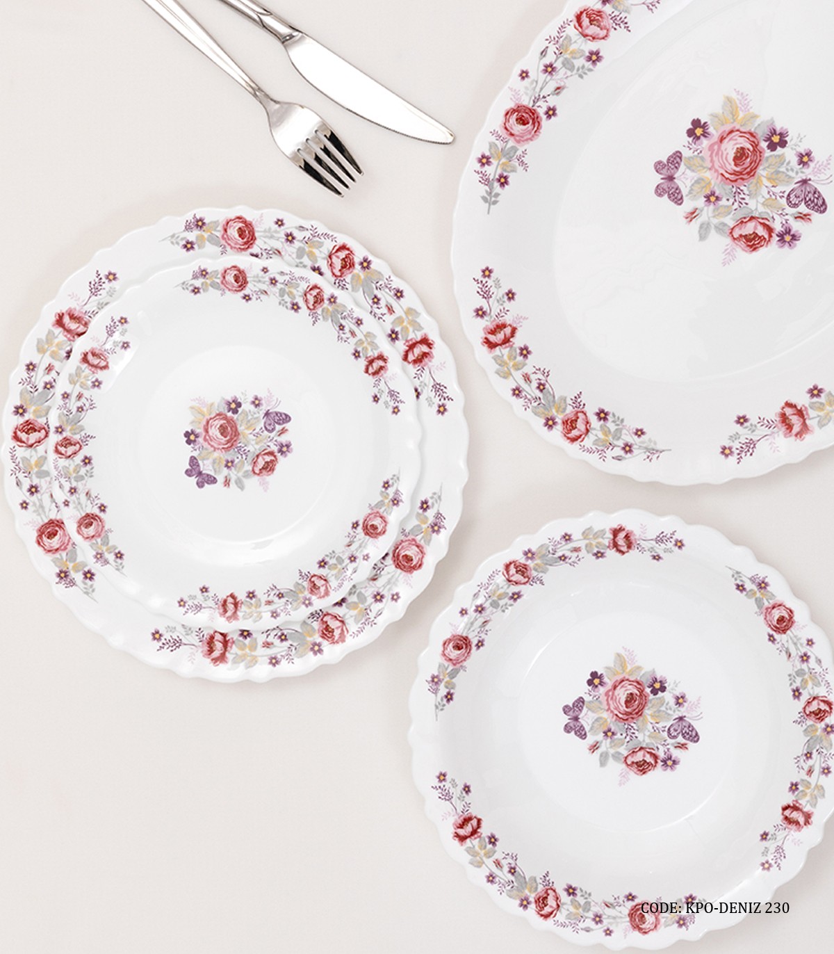 شامل | دیس -کاسه سالاد – بشقاب غذاخوری – بشقاب خورش خوری – پیش دستی – کاسه ماست خوری – نمک پاش |