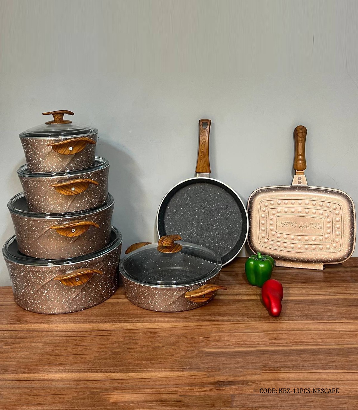 سرویس قابلمه گرانیتی ۱۳ پارچه بیزیم رنگ نسکافه ای با دسته طرح چوب