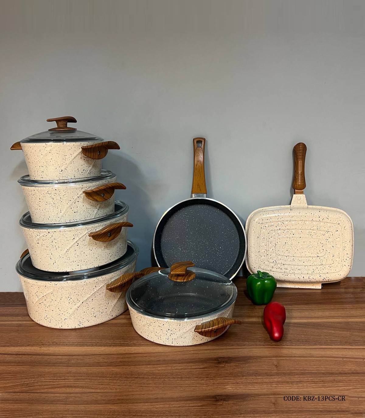 سرویس قابلمه گرانیتی ۱۳ پارچه بیزیم رنگ کرم با دسته طرح چوب