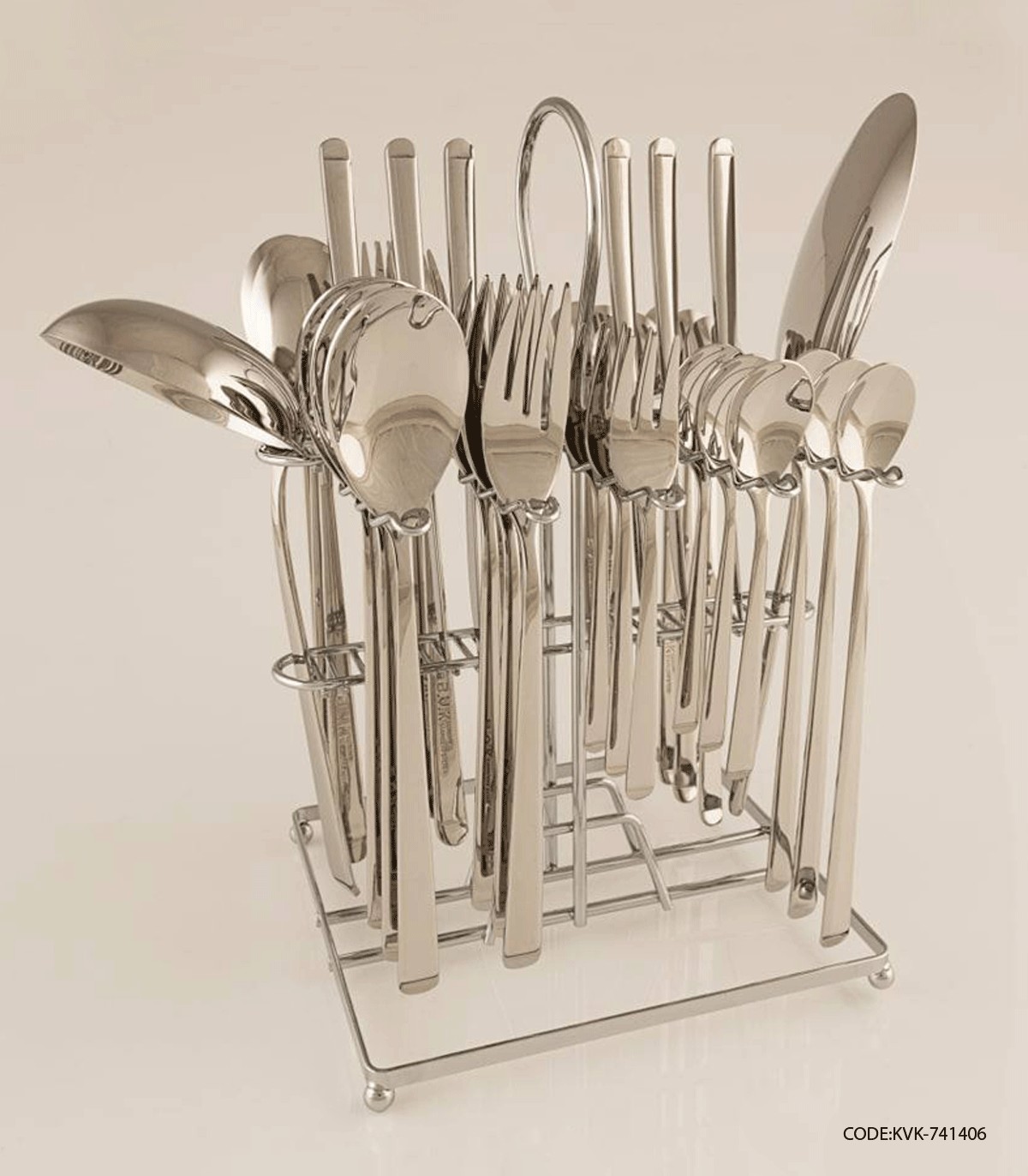 - شامل 6 عدد قاشق، 6 عدد چنگال، 6 عدد کارد میوه خوری، 6 عدد چنگال میوه خوری، 6 عدد قاشق شربت خوری، 6 عدد قاشق چای خوری، 1 عدد ملاقه، 1 عدد کفگیر، 1 عدد استند