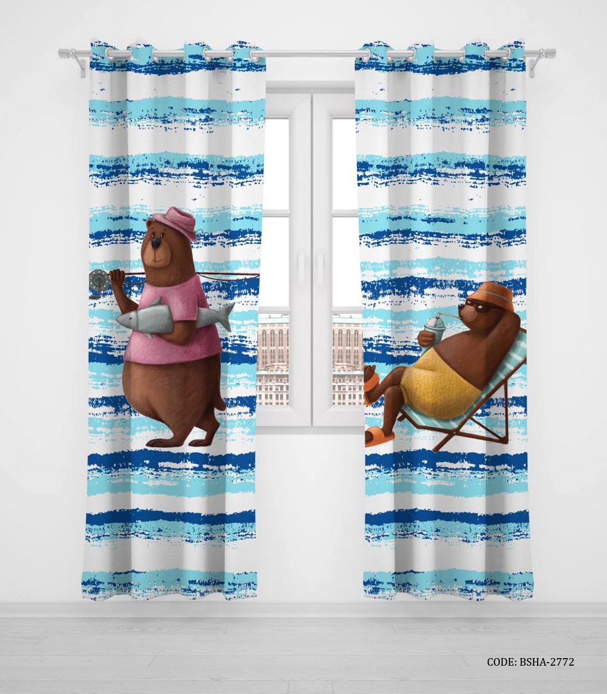 پرده پانچی دو تکه اتاق کودک پسرانه طرح خرس مدل Sea