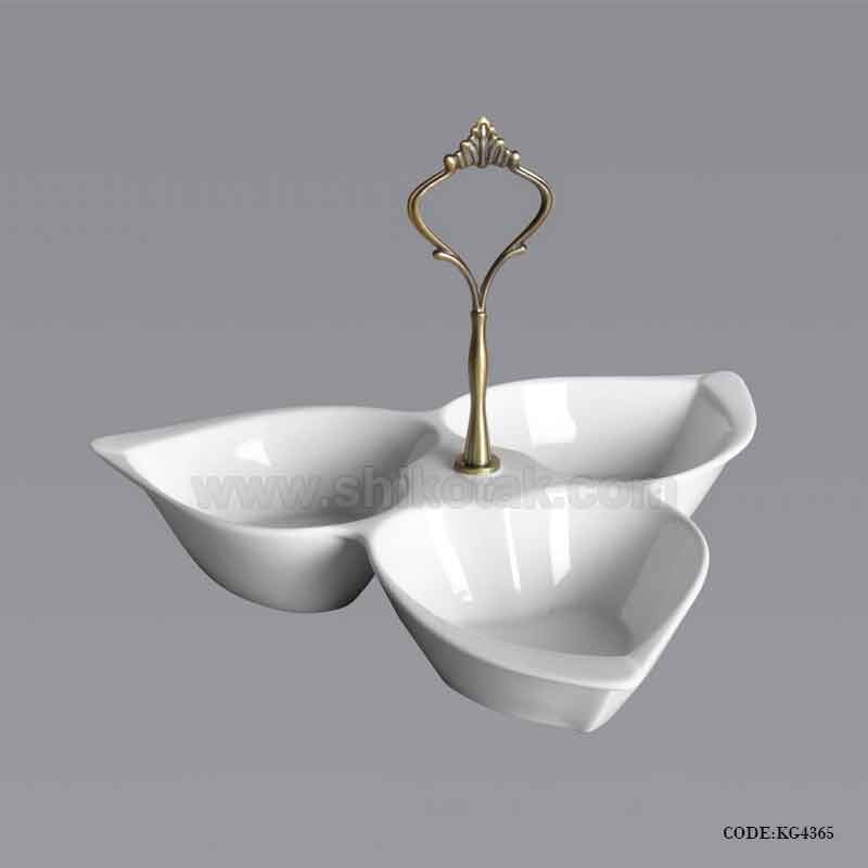 ظرف اردو خوری سرامیکی طرح قلب شامل سه ظرف گود کوچک طرح قلب است که در داخل یک بشقاب سرامیکی قرار دارد . یک دسته فلزی به بشقاب سرامیکی وصل است و امکان جابجایی راحت تر ظرف را فراهم می کند .