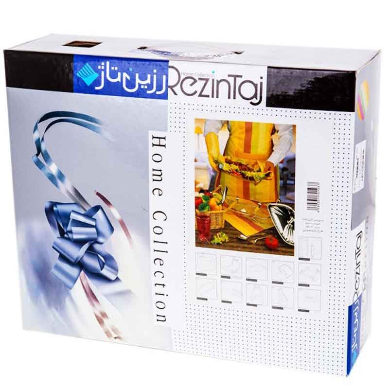 • شامل: دم کنی کشدار دو عدد ، دستگیره دو عدد، دستکش فر دو عدد، دستمال سفره چهار عدد، پیشبند، روقوری، حوله آشپزخانه، کیسه سبزی دو عدد، دستگیره یخچال دو عدد، سبد نان، زیربشقابی دو عدد