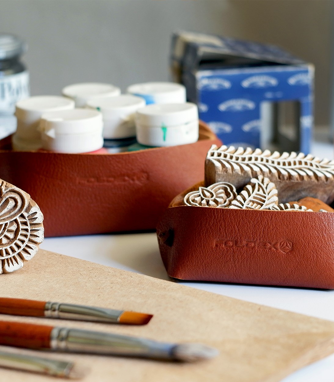 تیم فولدکس، یک ست دوتایی باکس مربعی چرمی که با بند چرمی بسته می شوند، طراحی کرده است که به عنوان ست اداری یا روی میز تحریر در منزل قابل استفاده است. درون آن می توان انواع ملزومات اداری کوچک نظیر انواع کاغذ یادداشت، گیره کاغذ و لوازم التحریر کوچک را جای داد.