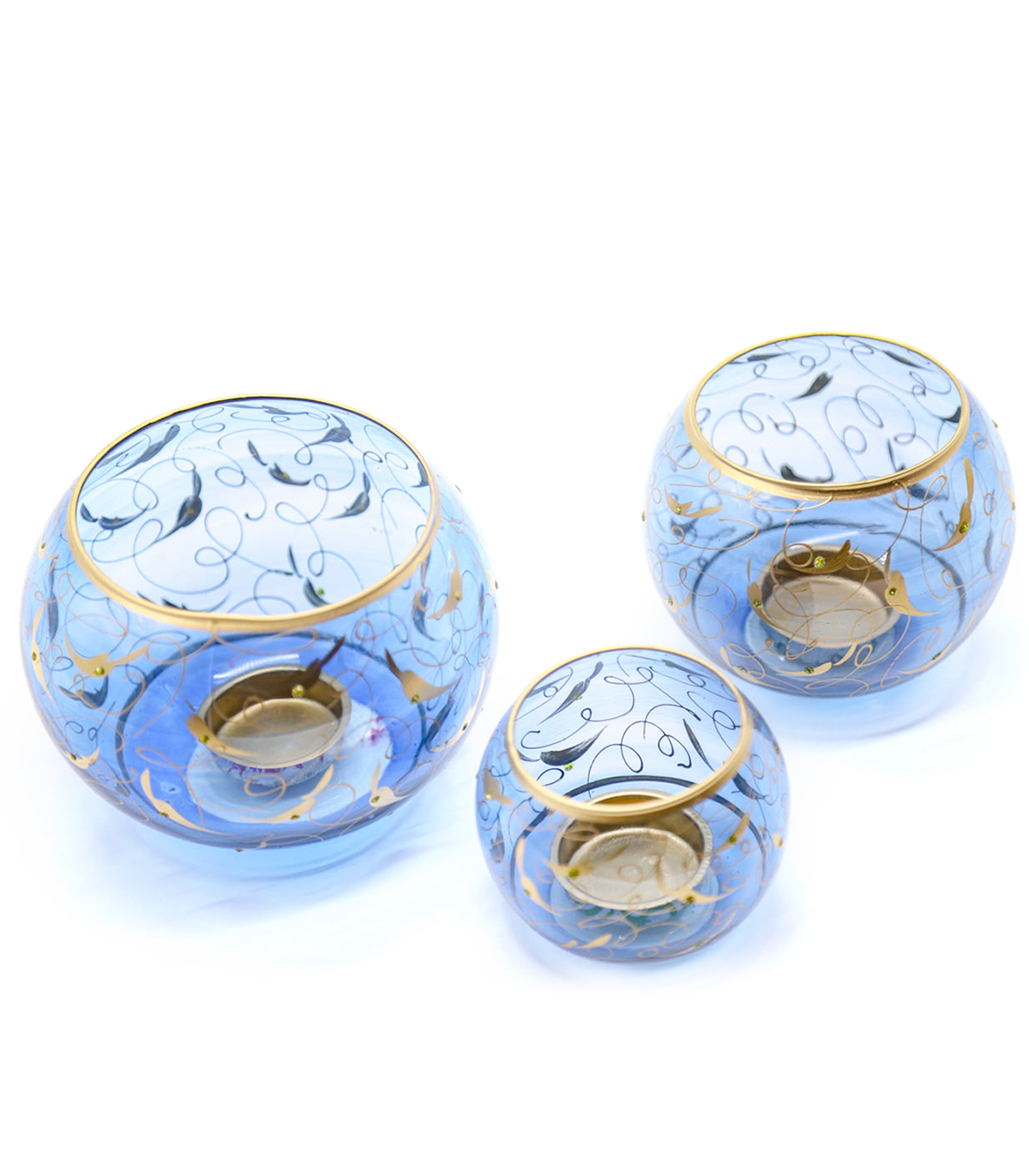ست جا شمعی بلوری بوم طرح پر کار آبی و طلایی