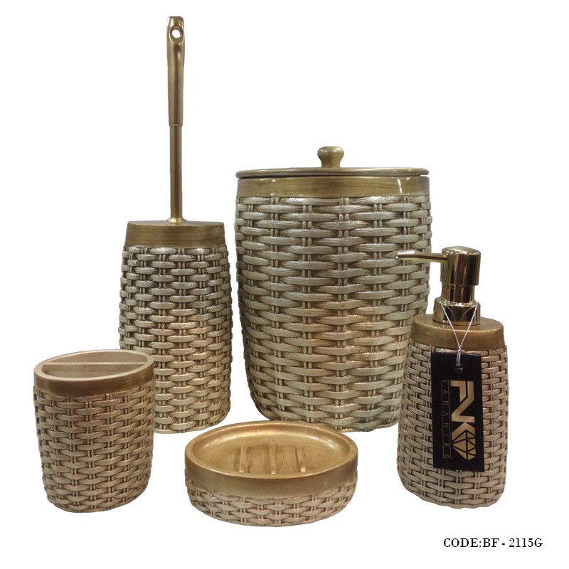 - شامل یک عدد سطل زباله همراه با درب، یک عدد فرچه و محفظه فرچه، یک عدد لیوان جامسواکی، یک عدد جاصابونی، یک عدد جای مایع دستشویی