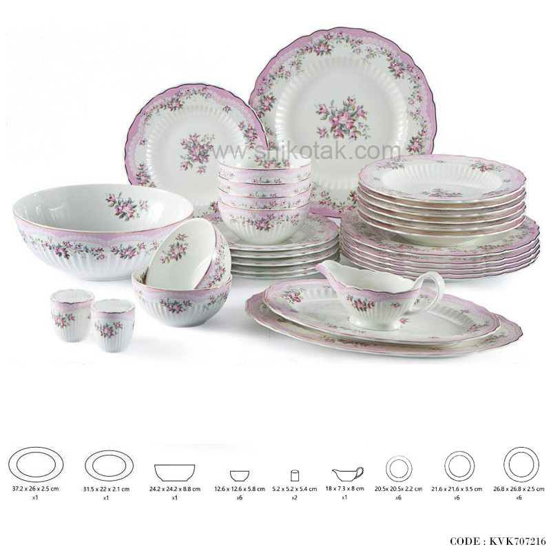 - شامل 6عدد پلوخوری، 6عدد خورش خوری، 6عدد میوه خوری (پیش دستی)، 6عدد پیاله، 1عدد دیس بزرگ، 1عدد دیس کوچک، 1عدد نمکدان، 1عدد فلفل پاش، 1عدد کاسه بزرک سالاد خوری، 1عدد سس خوری