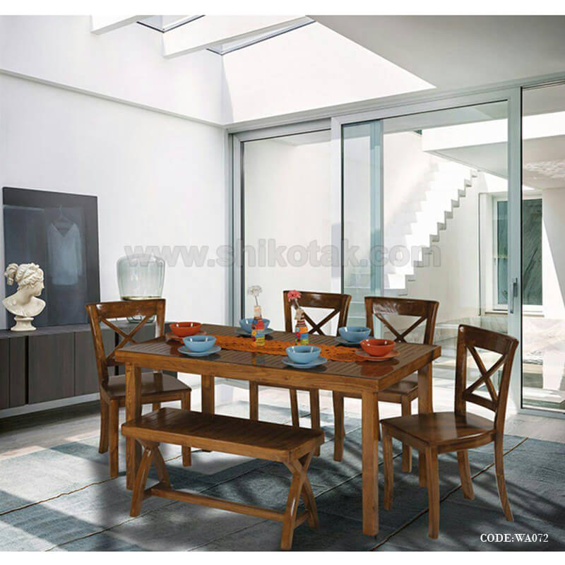 - شامل یک میز ناهار خوری شش نفره- 4 عدد صندلی تک و یک عدد نیمکت چوبی دو نفره
