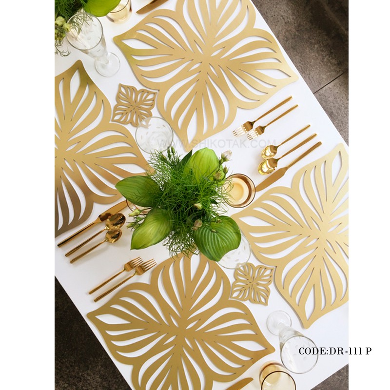 - شامل شش عدد زیر بشقابی طلایی، شش عدد زیر لیوانی طلایی و شش عدد حلقه دستمال طلایی