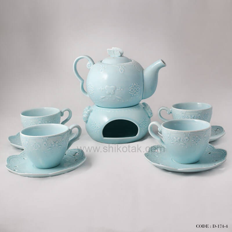 - شامل 4 عدد فنجان و نعلبکی، یک عدد قوری وارمر دار