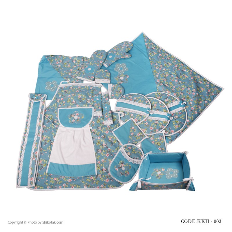 شامل | نمگیر ظرف، پیش بند همراه با یک حوله متصل، سه عدد دمکنی کش دار، دو عدد دستکش فر، دو عدد دستگیره مربعی، کیسه نان و سبزی،جای سیخ، دو عدد دستگیره قابلمه، دستگیره برای درب یخچال، سفره پاک کن |