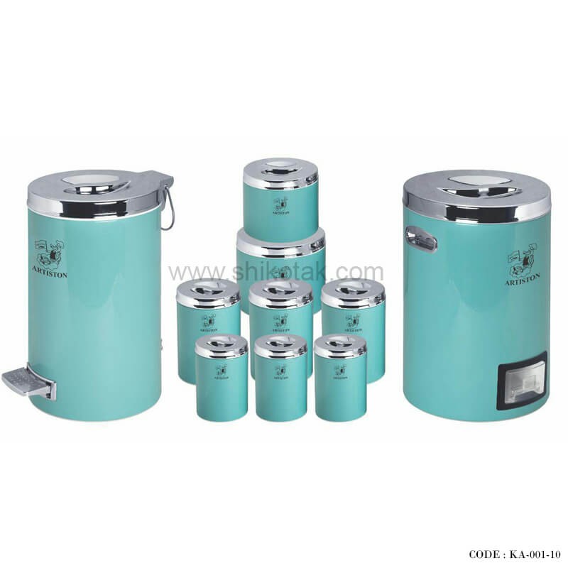 - شامل سه عدد بانکه بزرگ 1.5 کیلویی، سه عدد بانکه متوسط 1کیلویی، یک عدد سطل برنج 12 لیتری پدال دار، یک عدد سطل زباله 12 لیتری پدال دار، یک عدد سطل قند قطر 24 سانتی، یک عدد سطل شکر قطر 20 سانتی