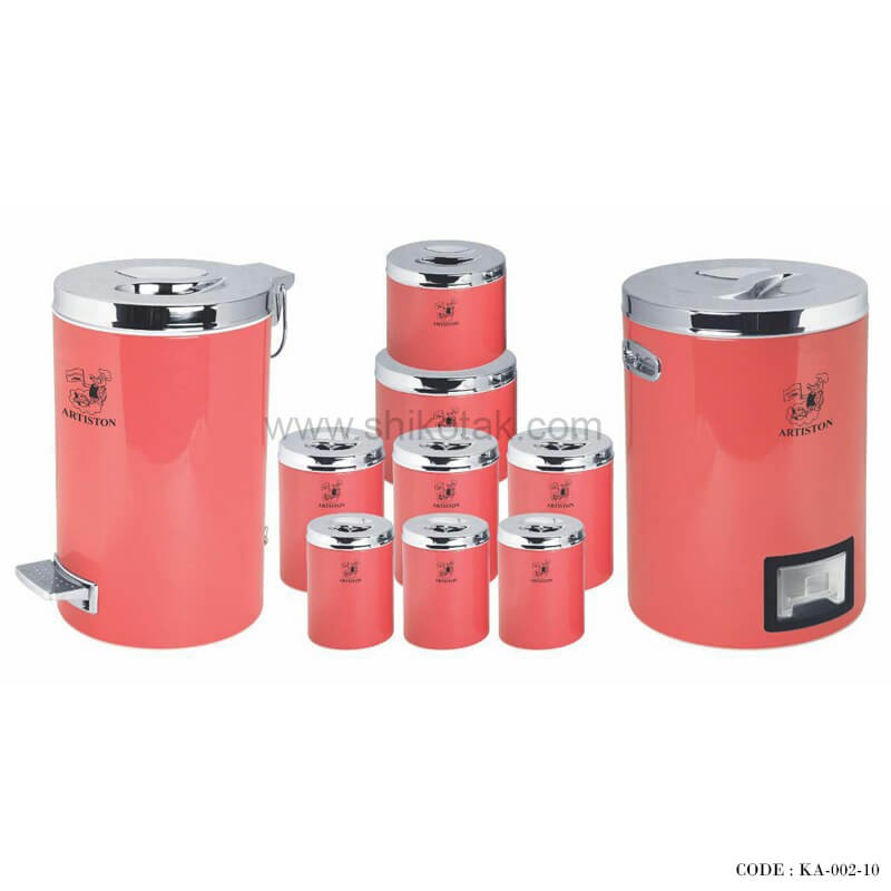 - شامل سه عدد بانکه بزرگ 1.5 کیلویی، سه عدد بانکه متوسط 1کیلویی، یک عدد سطل برنج 12 لیتری پدال دار، یک عدد سطل زباله 12 لیتری پدال دار، یک عدد سطل قند قطر 24 سانتی، یک عدد سطل شکر قطر 20 سانتی