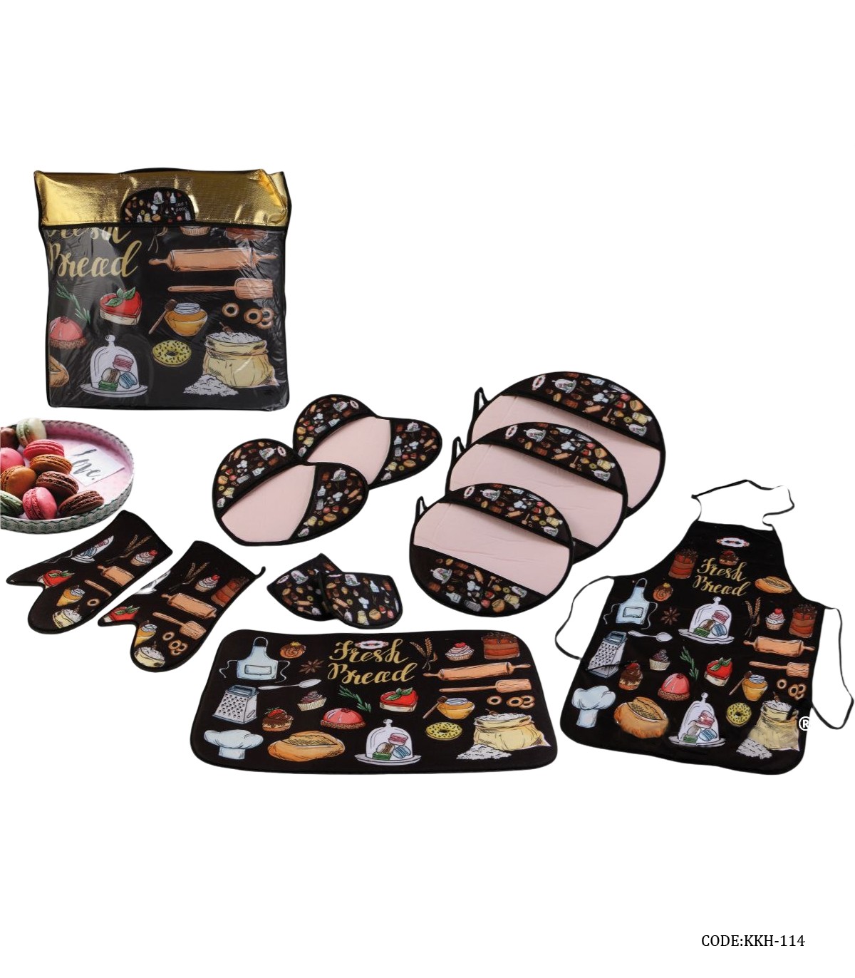 شامل | 3عدد دمکنی، 1عدد نمگیر ظروف، 1عدد پیشبند، 1جفت دستکش فر، 2عدد دستگیره قلبی، 2عدد دستگیره کوچک |