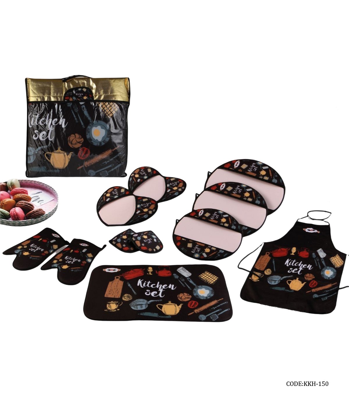 شامل | 3عدد دمکنی، 1عدد نمگیر ظروف، 1عدد پیشبند، 1جفت دستکش فر، 2عدد دستگیره قلبی، 2عدد دستگیره کوچک |