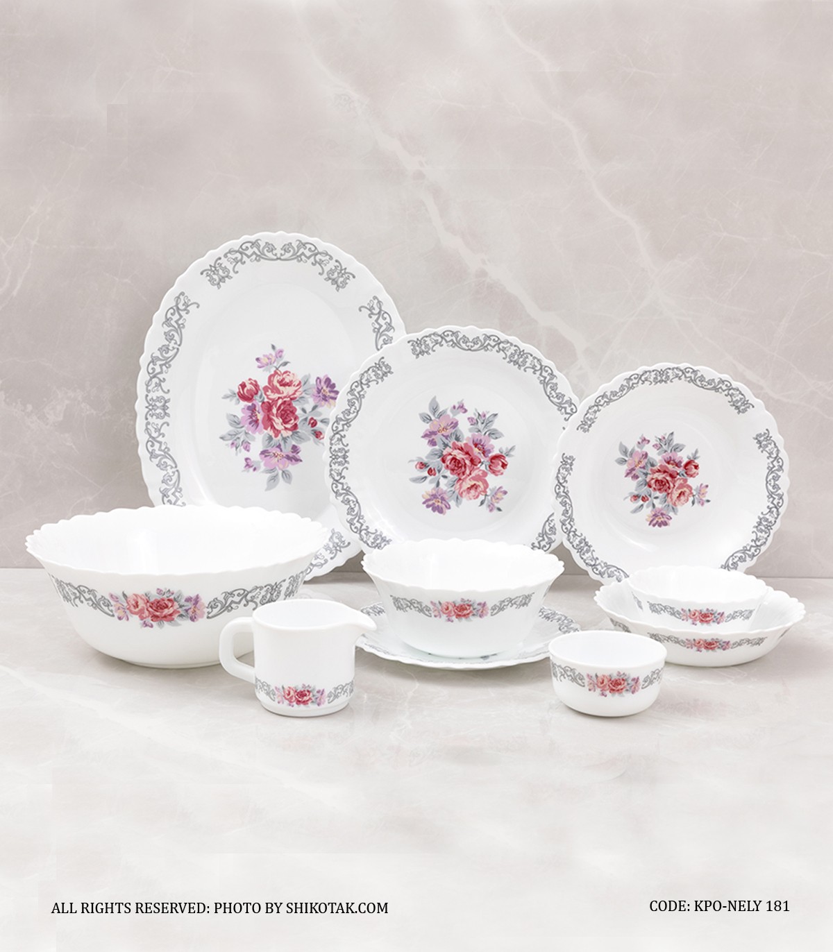 شامل | دیس -کاسه سالاد – بشقاب غذاخوری – بشقاب خورش خوری – پیش دستی – کاسه ماست خوری – نمک پاش |
