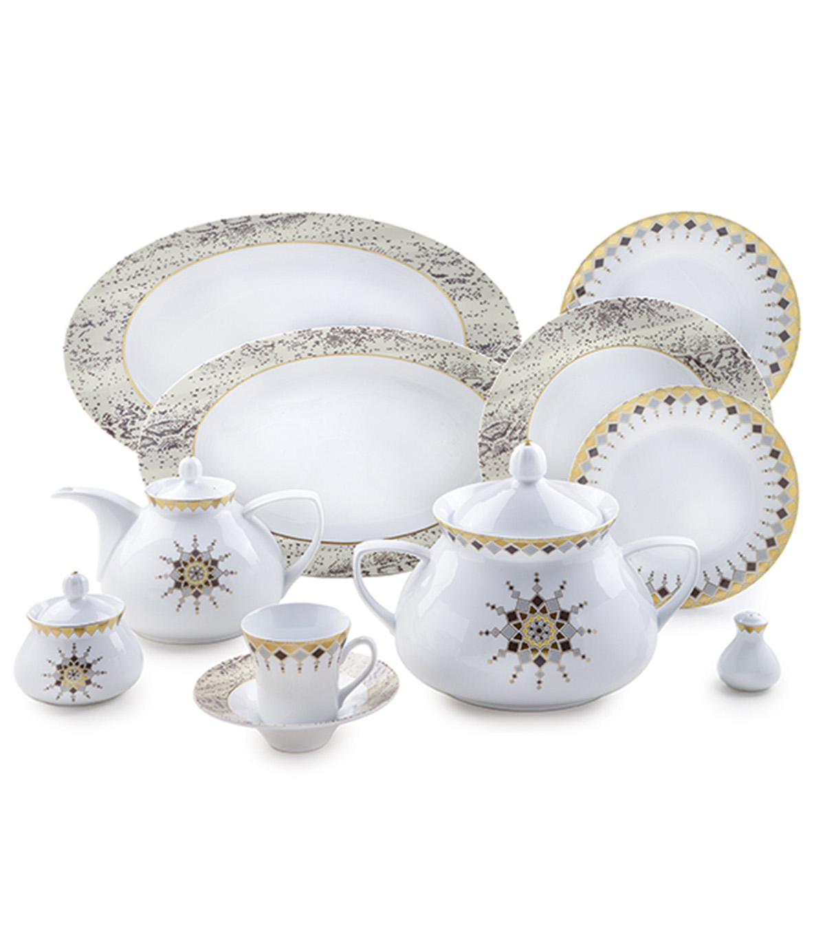 • شامل: 12عدد پلوخوری، 12عدد خورش خوری، 18عدد میوه خوری، 2عدد دیس بیضی کوچک، یک عدد دیس بیضی بزرگ، 12 عدد پیاله کوچک، 6 عدد پیاله بزرگ، 3 عدد کاسه آبگوشت خوری، 2عدد سالاد خوری، 12عدد فنجان، 12عدد نعلبکی، یک عدد سوپ خوری همراه با درپوش، 6عدد نمک پاش، یک عدد قوری همراه با درپوش، یک عدد قندان همراه با درپوش، 2 عدد شیرخوری یا شکر ریز