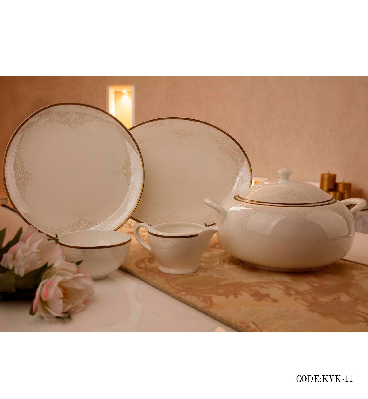 • شامل 24عدد پلوخوری، 24عدد خورش خوری، 24عدد میوه خوری (پیش دستی)، 18عدد پیاله، 2عدد دیس بیضی بزرگ، 1عدد سس خوری، 1عدد کاسه بزرگ، 3عدد نمکدان، 3عدد فلفل پاش، 2عدد دیس بیضی کوچک، یک عدد سوپ خوری همراه با در، 1عدد قوری همراه با در، 12عدد فنجان و نعلبکی، 6عدد قهوه خوری و نعلبکی، 1عدد قندان همراه با در، 1عدد شکرریز، 6عدد حلقه دستمال، 1عدد سس خوری، 6عدد کاسه آبگوشت خوری
