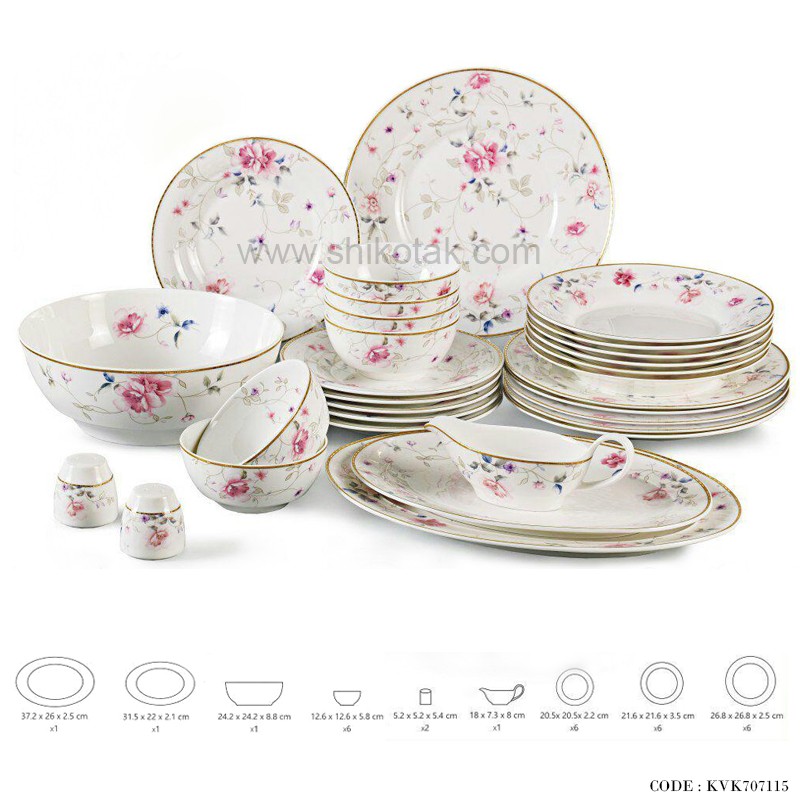 - شامل 6عدد پلوخوری، 6عدد خورش خوری، 6عدد میوه خوری (پیش دستی)، 6عدد پیاله، 1عدد دیس بزرگ، 1عدد دیس کوچک، 1عدد نمکدان، 1عدد فلفل پاش، 1عدد کاسه بزرک سالاد خوری، 1عدد سس خوری