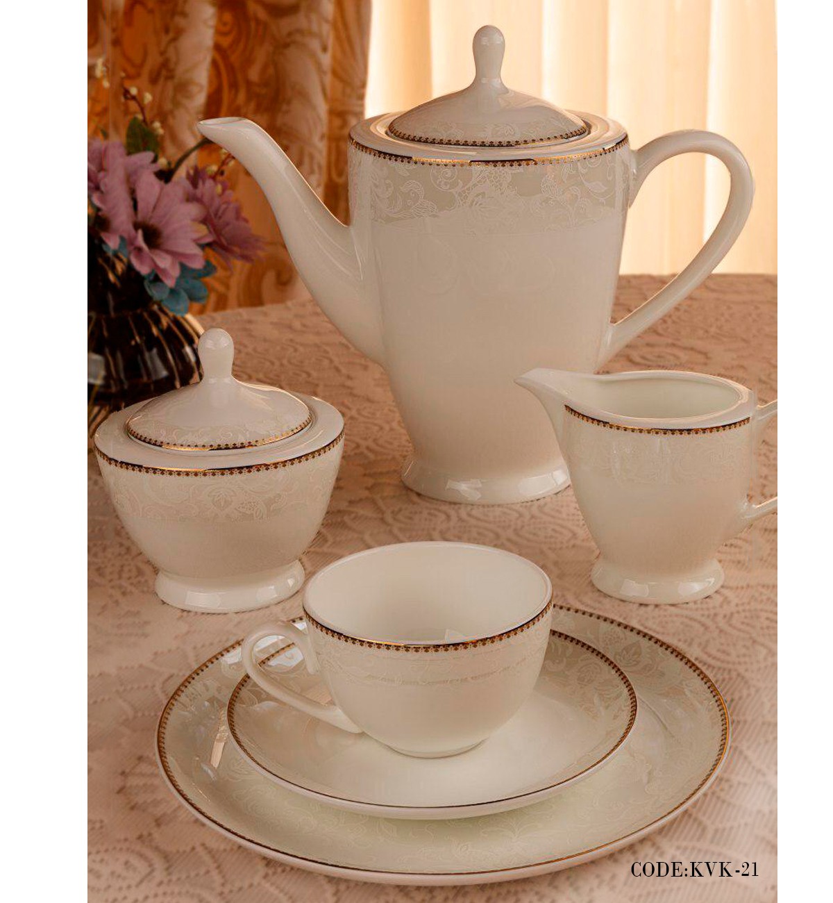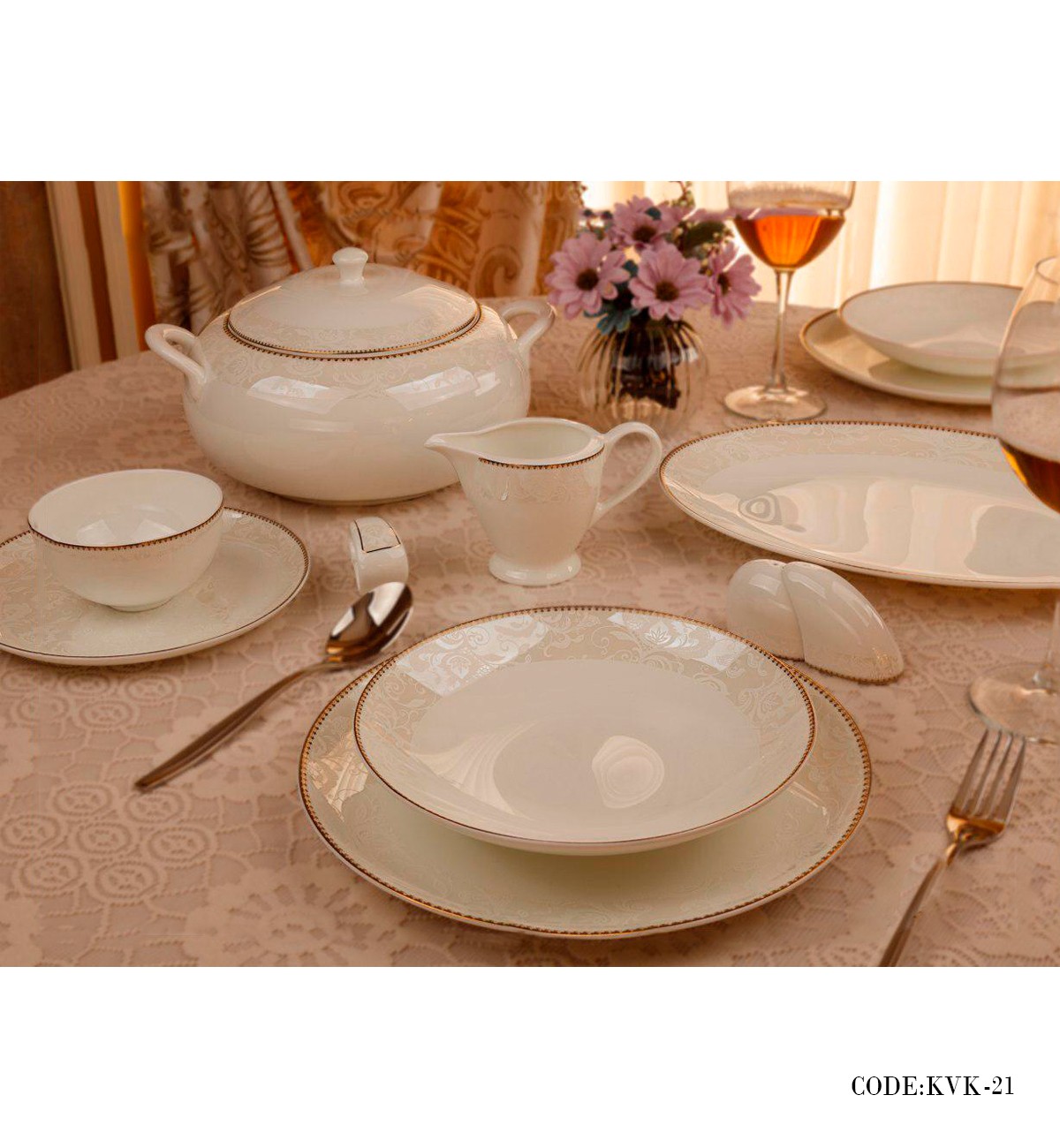 - شامل 18عدد پلوخوری، 18عدد خورش خوری، 18عدد میوه خوری (پیش دستی)، 18عدد پیاله، 2عدد دیس بیضی بزرگ، 1عدد سس خوری، 1عدد کاسه بزرگ، 3عدد نمکدان، 3عدد فلفل پاش، 2عدد دیس بیضی کوچک، یک عدد سوپ خوری همراه با در، 1عدد قوری همراه با در، 12عدد فنجان و نعلبکی، 6عدد قهوه خوری و نعلبکی، 1عدد قندان همراه با در، 1عدد شکرریز، 6عدد حلقه دستمال، 1عدد سس خوری