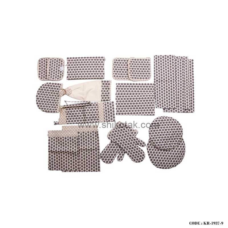 - شامل: دم کنی کشدار دو عدد ، دستگیره دو عدد، دستکش فر دو عدد، دستمال سفره چهار عدد، پیشبند، روقوری، حوله آشپزخانه، کیسه سبزی دو عدد، دستگیره یخچال دو عدد، سبد نان، زیربشقابی دو عدد