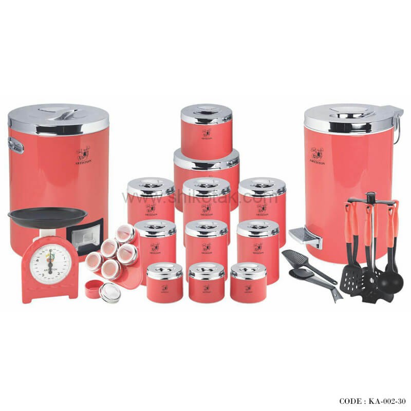 - شامل سه عدد بانکه بزرگ 1.5 کیلویی، سه عدد بانکه متوسط 1کیلویی، سه عدد بانکه کوچک نیم کیلویی، یک عدد ترازو با ابعاد 18x8x26، ست کفگیر و ملاقه به همراه استند آویز، شش عدد جا ادویه مگنتی به همراه استند، یک عدد سطل برنج 12 لیتری پدال دار، یک عدد سطل زباله 12 لیتری پدال دار، یک عدد روغن گیر، یک عدد زیرقاشقی، یک عدد سطل قند قطر 24 سانتی، یک عدد سطل شکر قطر 20 سانتی