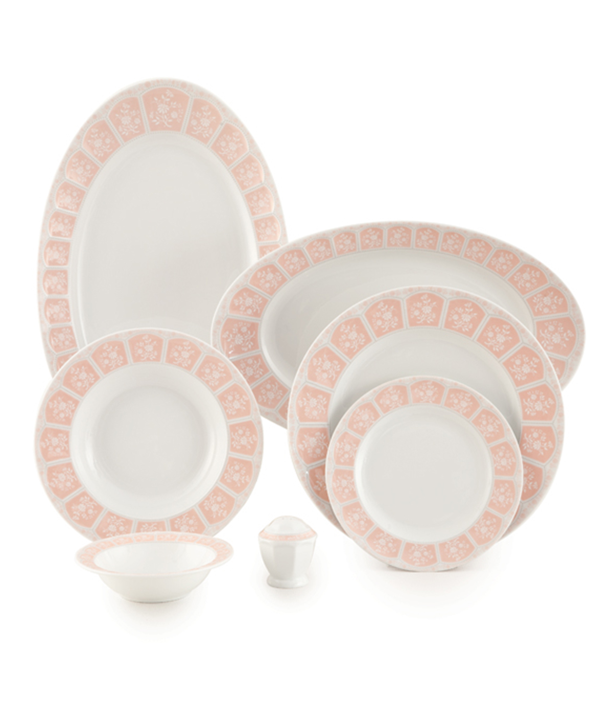شامل | 6عدد پلوخوری، 6عدد خورش خوری، 6عدد میوه خوری، یک عدد دیس بیضی کوچک، یک عدد دیس بیضی بزرگ، 6عدد سالاد خوری کوچک، 2عدد نمک پاش |