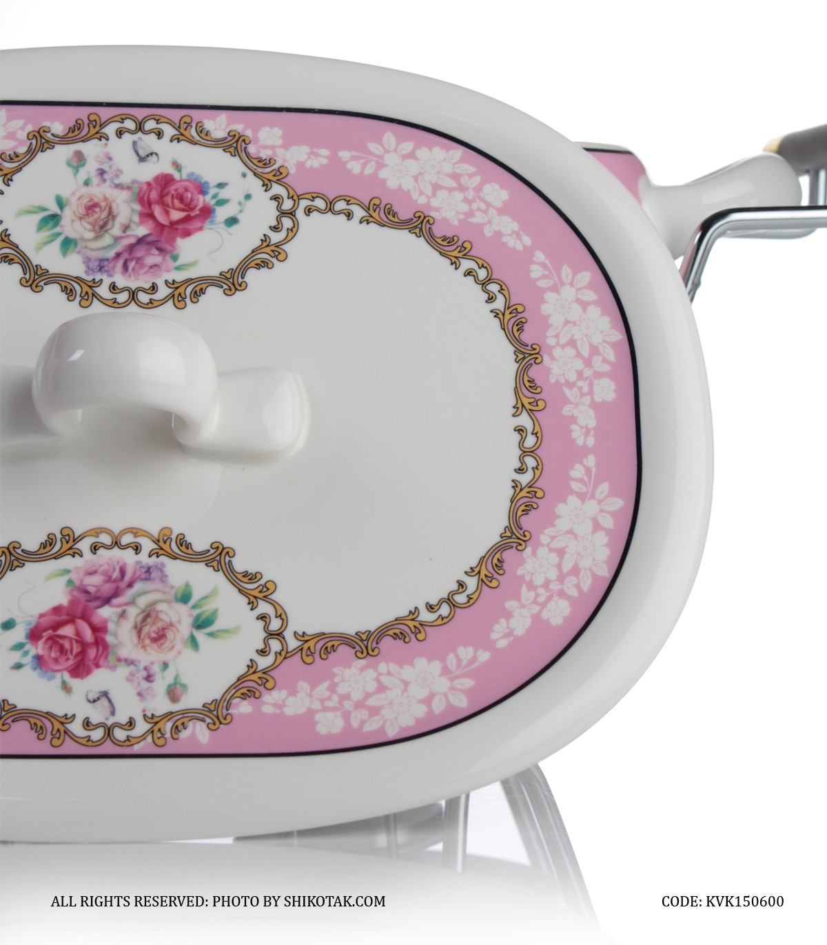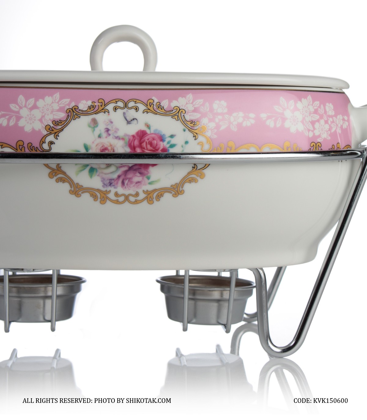 ظرف سوفله سرامیکی گل سرخی مستطیل کوچک یک انتخاب خوب برای میز پذیرایی شما محسوب می شود . این ظرف سوفله به صورت بیضی طراحی شده است . در طراحی آن از گل سرخ که طرح انگلیسی قدیمی است استفاده شده است و مزین به طلای طبیعی است