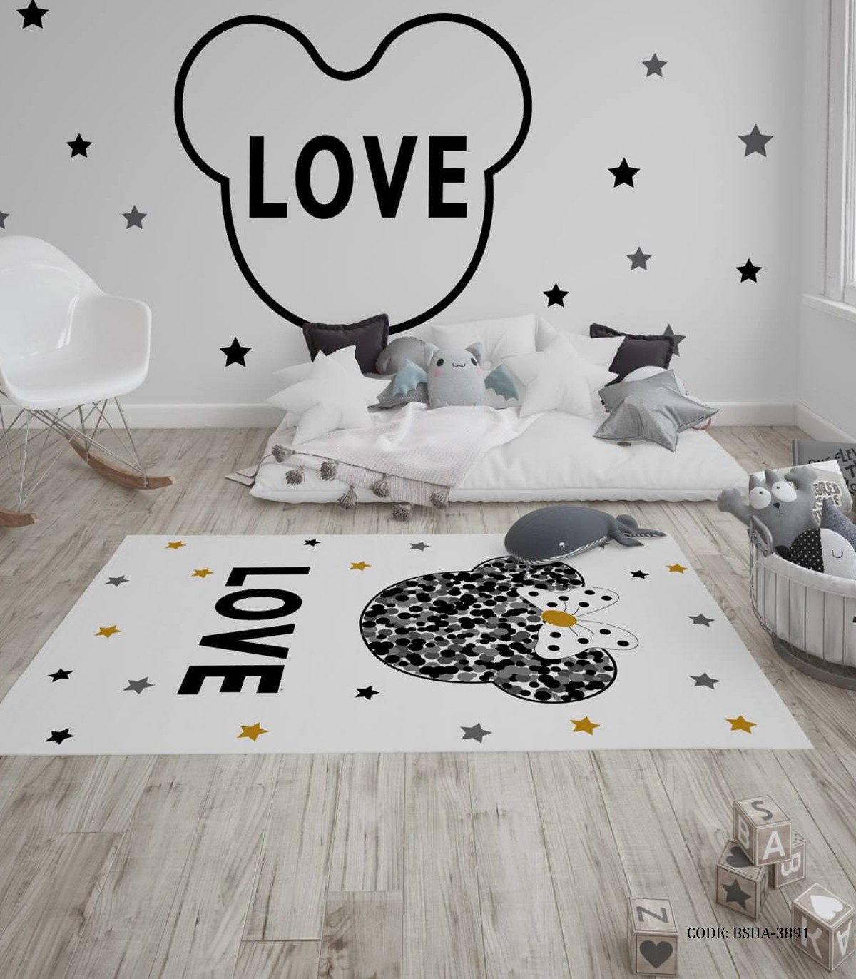 فرش اتاق دخترانه طرح میکی موس سفید مشکی مدل Love