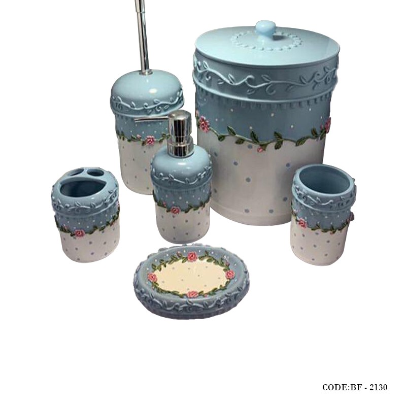 شامل | یک عدد سطل زباله همراه با درب، یک عدد فرچه و محفظه فرچه، یک عدد لیوان جامسواکی، یک عدد جاصابونی، یک عدد جای مایع دستشویی |