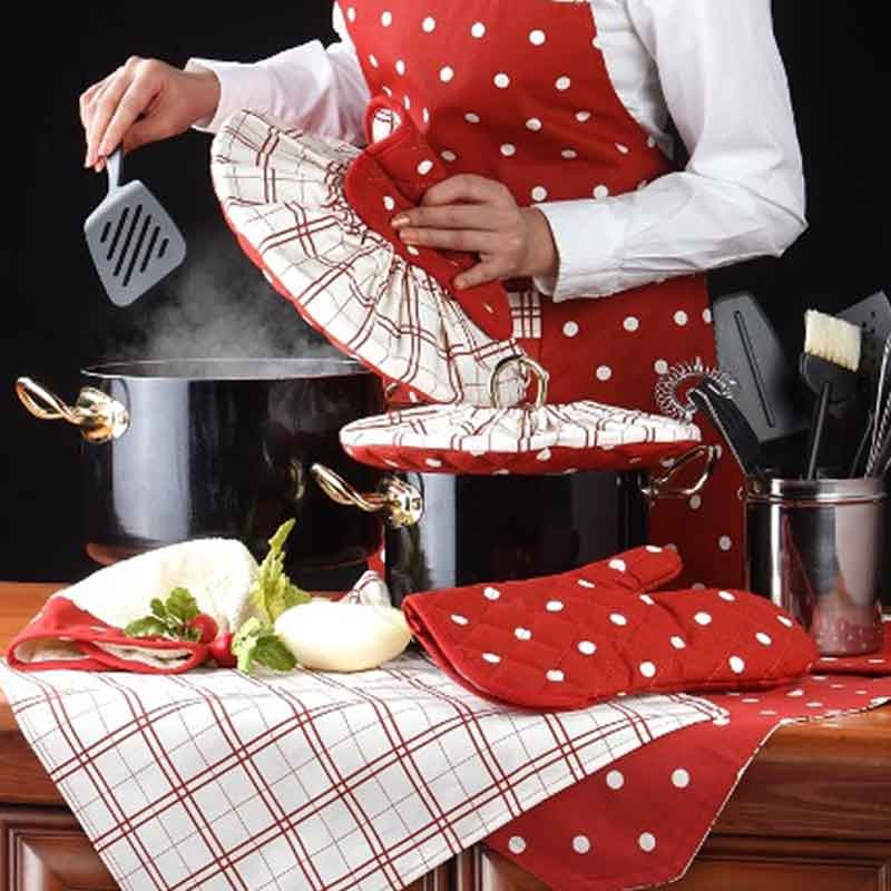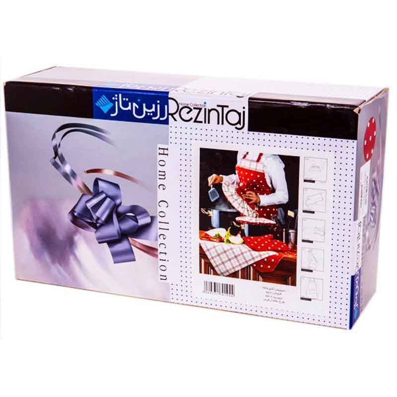 رزین تاز به عنوان یکی از شرکت های مطرح و پیشگام در عرصه تولید سرویس آشپزخانه و کالای خواب و حمام اقدام به تولید طرح های متنوع و با کیفیت سرویس پارچه ای آشپزخانه نموده است . ست آشپزخانه خالدار قرمز رزین تاژ شامل 8 تکه است . این ست پارچه ای آشپزخانه شامل 2 عدد دمکنی کشدار ، 2 عدد دستگیره 1 عدد پیشبند ضد آب ، 1 عدد حوله آشپزخانه ، 2 عدد دستکش فر است .
