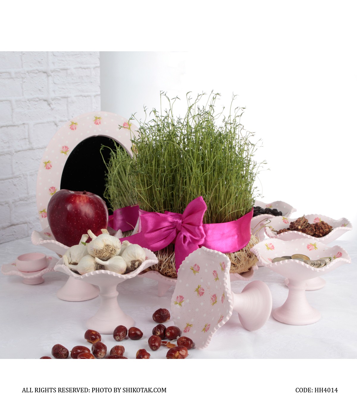 شامل | 6 عدد کاسه پایه دار -یک عدد ظرف مخصوص سبزه -دو عدد شمعدان و یک آینه |