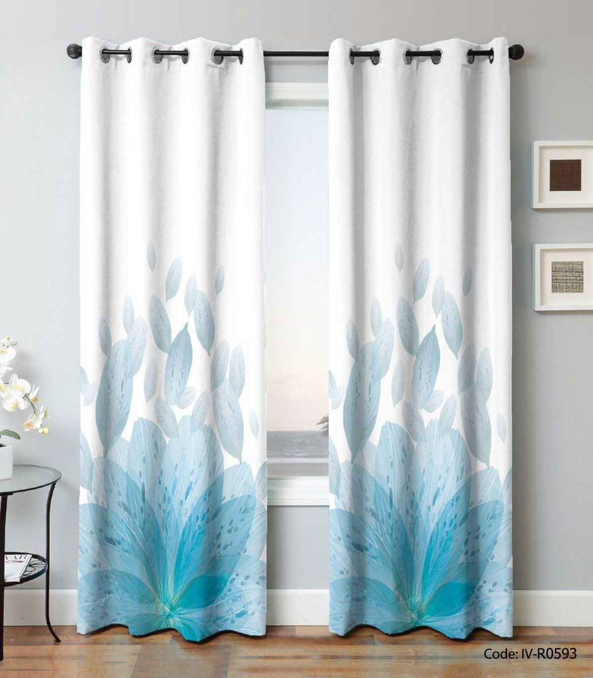 پرده اتاق پذیرایی پانچی مدل برگ آبی