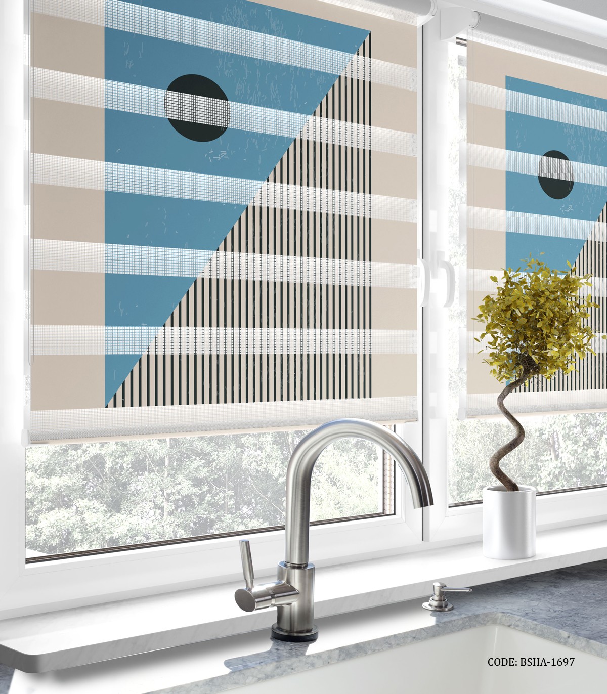 پرده زبرا آشپزخانه طرح طوسی آبی رهام