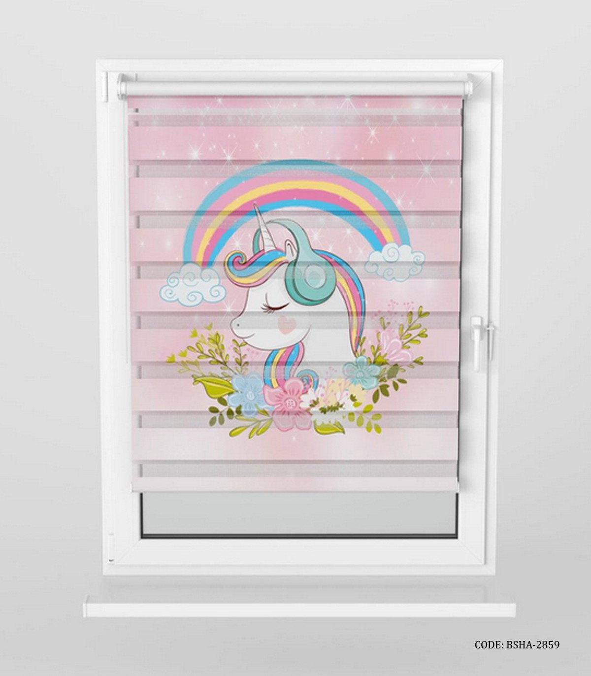 پرده زبرا اتاق کودک دخترانه طرح اسب تک شاخ و رنگین کمان