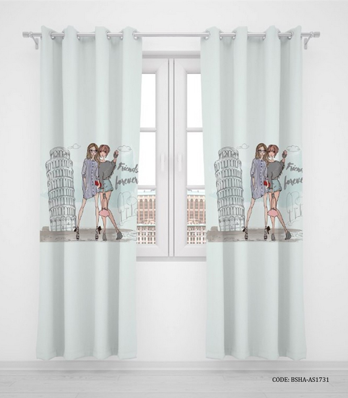 پرده پانچی دخترانه دو تکه طرح برج پیزا مدل Friends Love