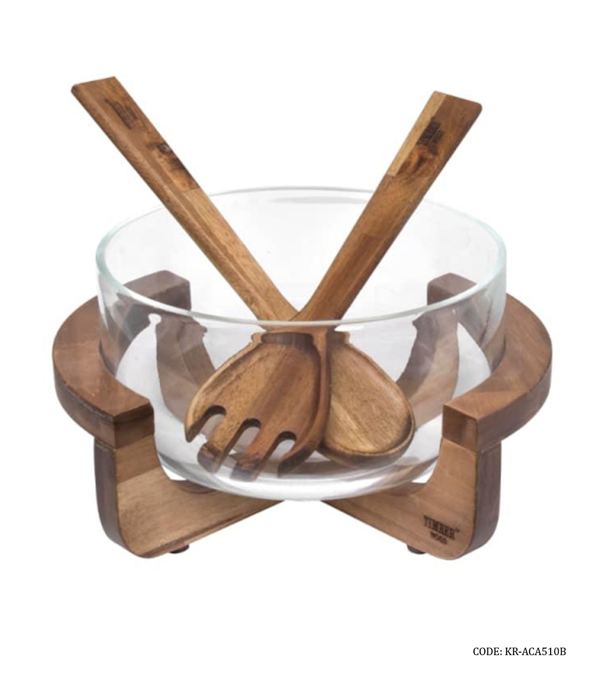 کاسه سالادخوری پایه چوبی با قاشق و چنگال چوبی