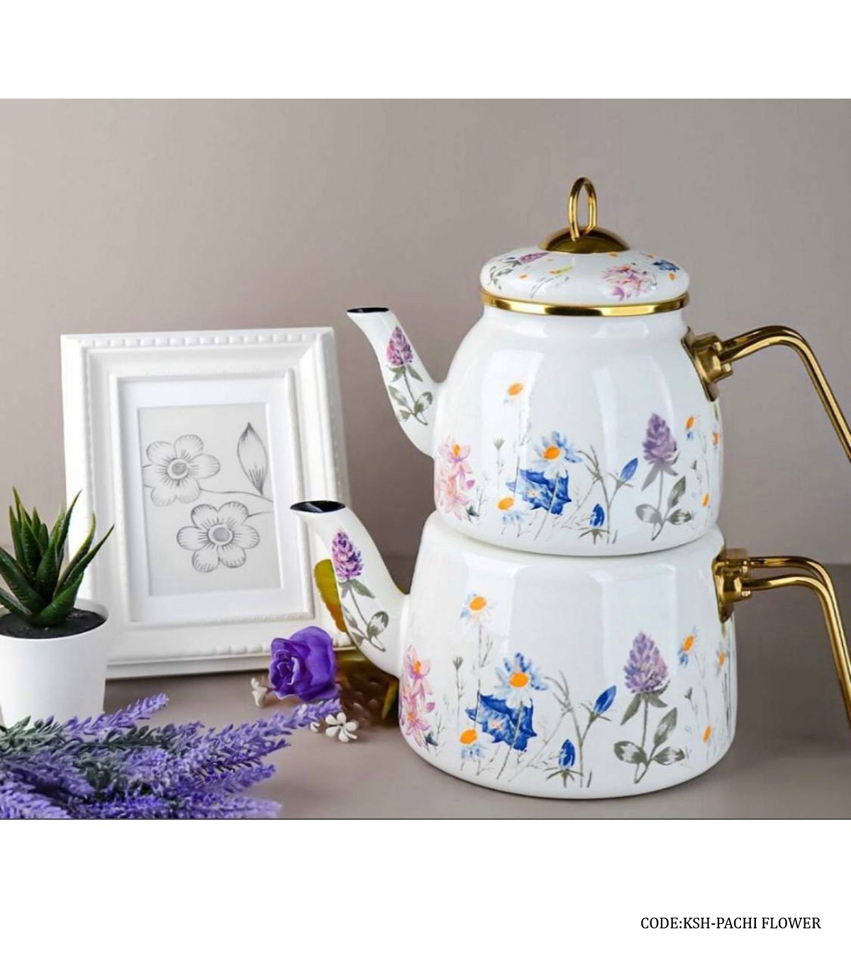 کتری و قوری دسته فلزی مدل PACHI FLOWER سفید