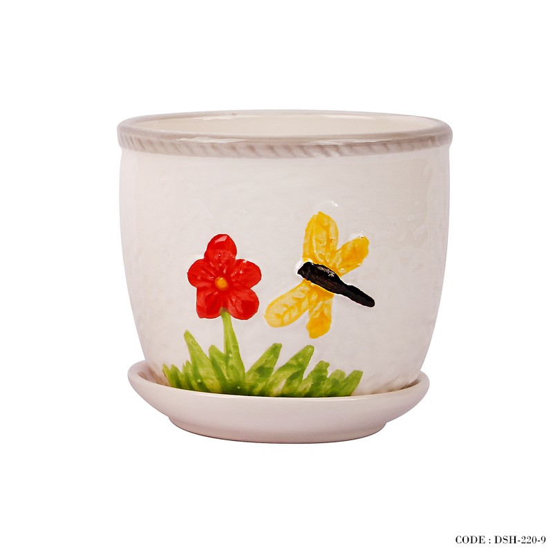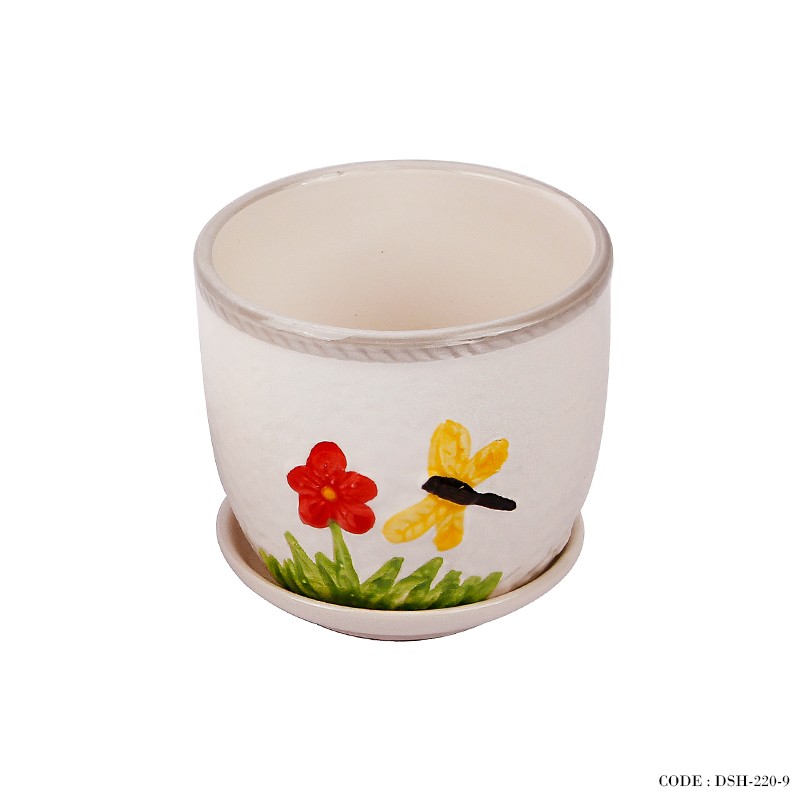 گلدان و زیر گلدانی سرامیکی طرح گل و پروانه